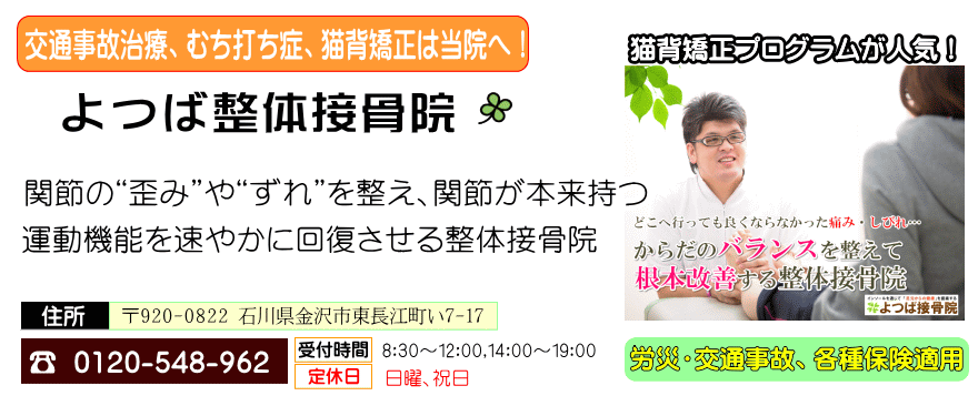 金沢市交通事故治療むち打ち症治療、猫背矯正のよつば接骨院です。